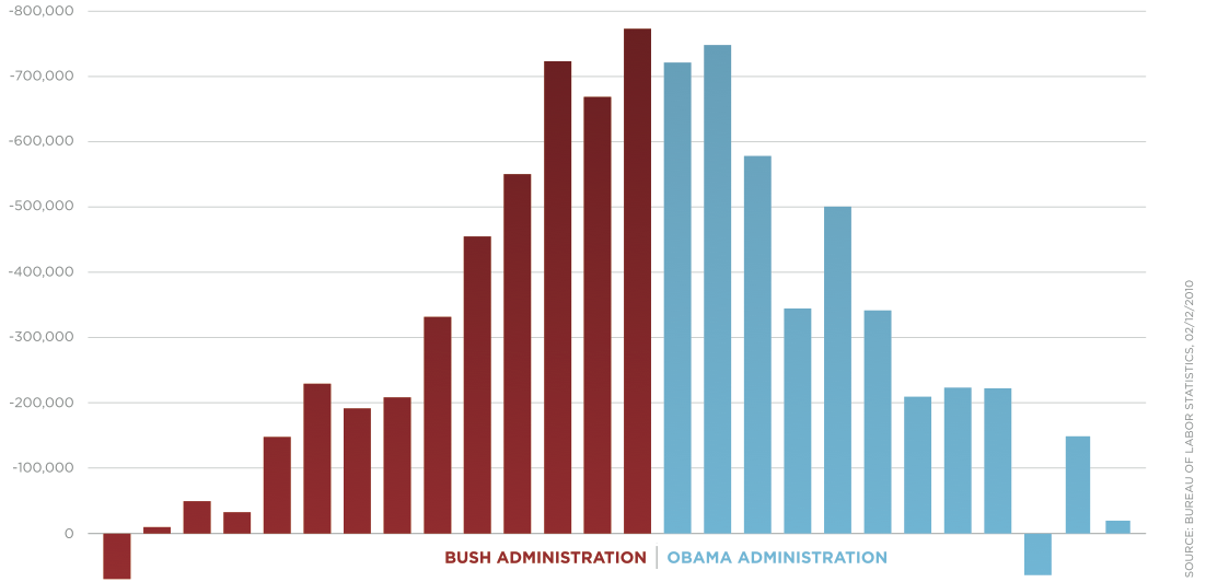 I have to say that I have admired this chart since the day it came out. It is clean with just the right amount of decoration to work: scales and legends that explain what we are seeing. The colors are based on the typical colors associated with the Republican Party (red) and the Democrats (blue). The data is also indisputable, coming from the Bureau of Labor Statistics.
